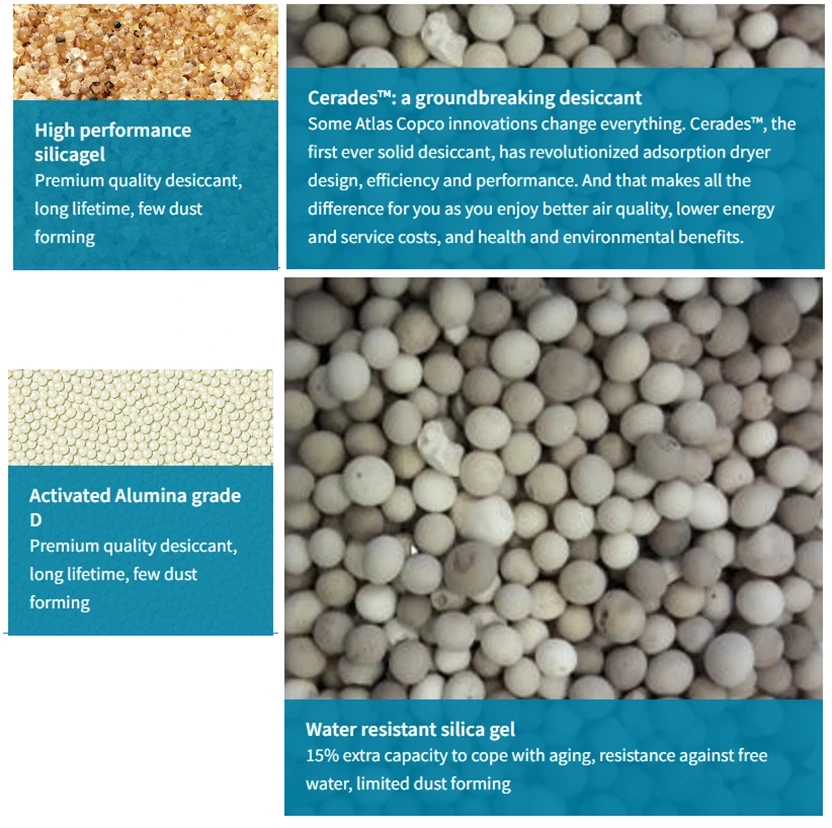 அழுத்தம் பனி புள்ளியைப் பொறுத்து, டெசிகண்ட்கள் அலுமினா, சிலிக்கா ஜெல் அல்லது மூலக்கூறு சல்லடைப் பொருட்களால் செய்யப்படலாம். குறைந்தபட்ச அழுத்த பனி புள்ளி -70℃ ஐ அடையலாம்.