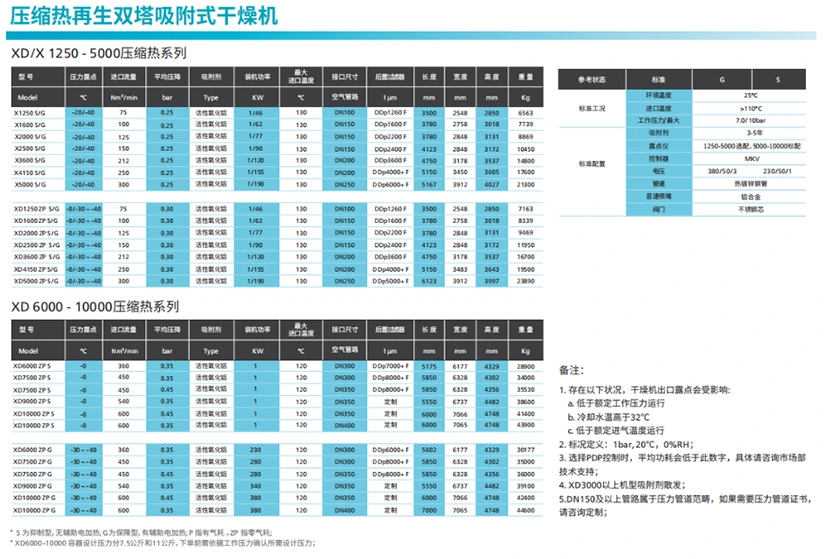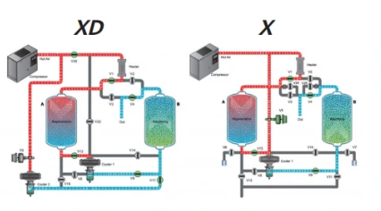 XD அல்லது X கம்ப்ரஷன் வெப்ப உறிஞ்சுதல் உலர்த்திகள் உயர்தர அட்ஸார்பென்ட்களைப் பயன்படுத்துகின்றன மற்றும் ஆயில்-ஃப்ரீ கம்ப்ரஸரில் இருந்து அழுத்தும் வெப்பத்தை திறம்பட பயன்படுத்தி உறிஞ்சியை மீண்டும் உருவாக்குகின்றன, இது ஆற்றல் நுகர்வு மற்றும் பராமரிப்பு செலவுகளை கணிசமாகக் குறைக்கிறது.