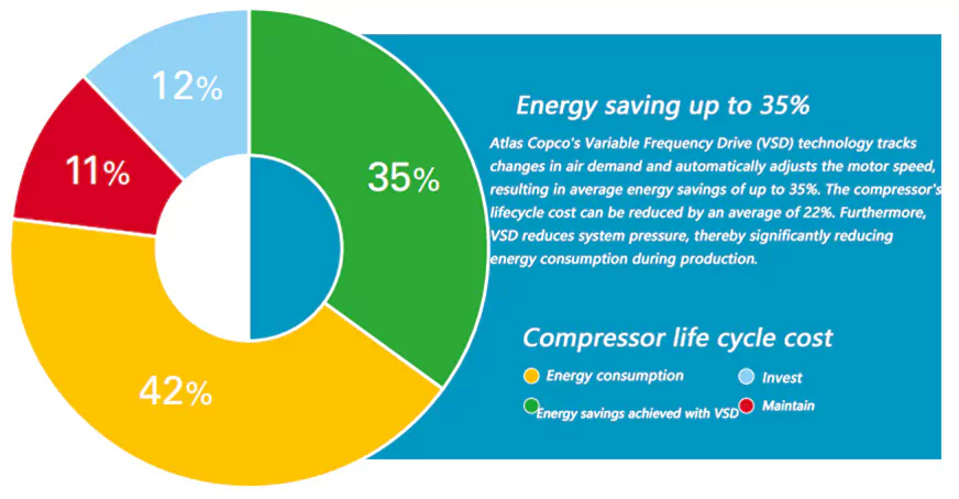 ஆயில்-ஃப்ரீ ஸ்க்ரூ ஏர் கம்ப்ரஸரின் மொத்த ஆயுட்காலச் செலவில் 80%க்கும் அதிகமான ஆற்றல் நுகர்வு ஆகும். மேலும், சுருக்கப்பட்ட காற்று உற்பத்தியில் பயன்படுத்தப்படும் மின்சாரம் ஒரு தொழிற்சாலையின் மொத்த மின்சார செலவில் 40%க்கும் அதிகமாக உள்ளது. ஆற்றல் செலவுகளைக் குறைக்க, அட்லஸ் காப்கோ, சுருக்கப்பட்ட காற்றுத் துறையில் மாறி அதிர்வெண் இயக்கி (VSD) தொழில்நுட்பத்தை முன்னோடியாகக் கொண்டு வந்தது. VSD ஆனது கணிசமான அளவு ஆற்றலைச் சேமிப்பதோடு மட்டுமல்லாமல் எதிர்கால சந்ததியினருக்கான சுற்றுச்சூழலையும் பாதுகாக்கிறது. இந்த தொழில்நுட்பத்தில் தொடர்ச்சியான முதலீட்டிற்கு நன்றி, அட்லஸ் காப்கோ சந்தையில் பரந்த அளவிலான ஒருங்கிணைந்த VSD கம்ப்ரசர்களை வழங்க முடியும்.