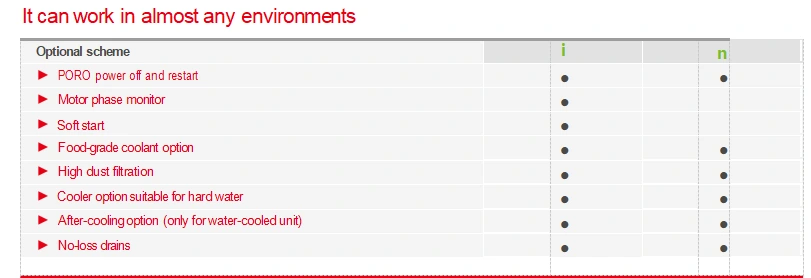 எங்கள் கம்ப்ரசர்கள் உணவு தர குளிரூட்டிகள், அதிக தூசி வடிகட்டுதல் & கடின நீர் குளிரூட்டிகள் மற்றும் கடுமையான சூழல்களுக்கு ஏற்ற பிற விருப்பங்களை வழங்குகின்றன, இது உங்கள் பல பயன்பாட்டு தேவைகளை பூர்த்தி செய்ய முடியும்.
