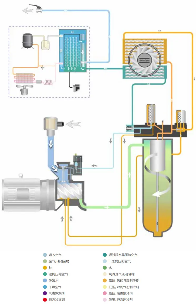 ·சுதந்திர குளிரூட்டும் விசிறி, அதிக திறன் கொண்ட குளிர்விப்பான் மற்றும் குழாய் வலையமைப்பில் மின்தேக்கி மற்றும் குழாய் அரிப்பை சிறப்பாக தவிர்க்க 5℃ பனி புள்ளி அழுத்தத்துடன் உள்ளமைக்கப்பட்ட உலர்த்தி