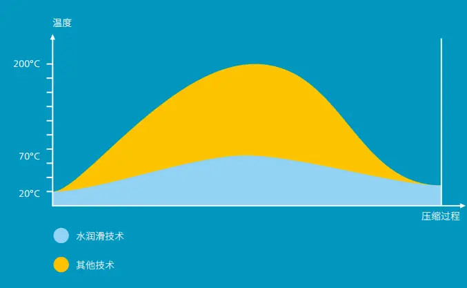 நீர் சிறந்த குளிரூட்டும் ஆற்றலைக் கொண்டுள்ளது மற்றும் மூலத்திலிருந்து வெப்பத்தை திறம்பட நீக்குகிறது. வெப்ப உற்பத்தியால் ஏற்படும் ஆற்றல் கழிவுகள் அகற்றப்படுகின்றன, மேலும் ஒரு கிலோவாட் ஆற்றலுக்கு அதிக அழுத்தப்பட்ட காற்றை உற்பத்தி செய்ய முடியும். குளிர்ச்சியான சுருக்கப்பட்ட காற்று கூறுகளின் வெப்ப அழுத்தத்தைக் குறைக்கிறது, அதன் மூலம் சேவை ஆயுளை நீட்டிக்கிறது.